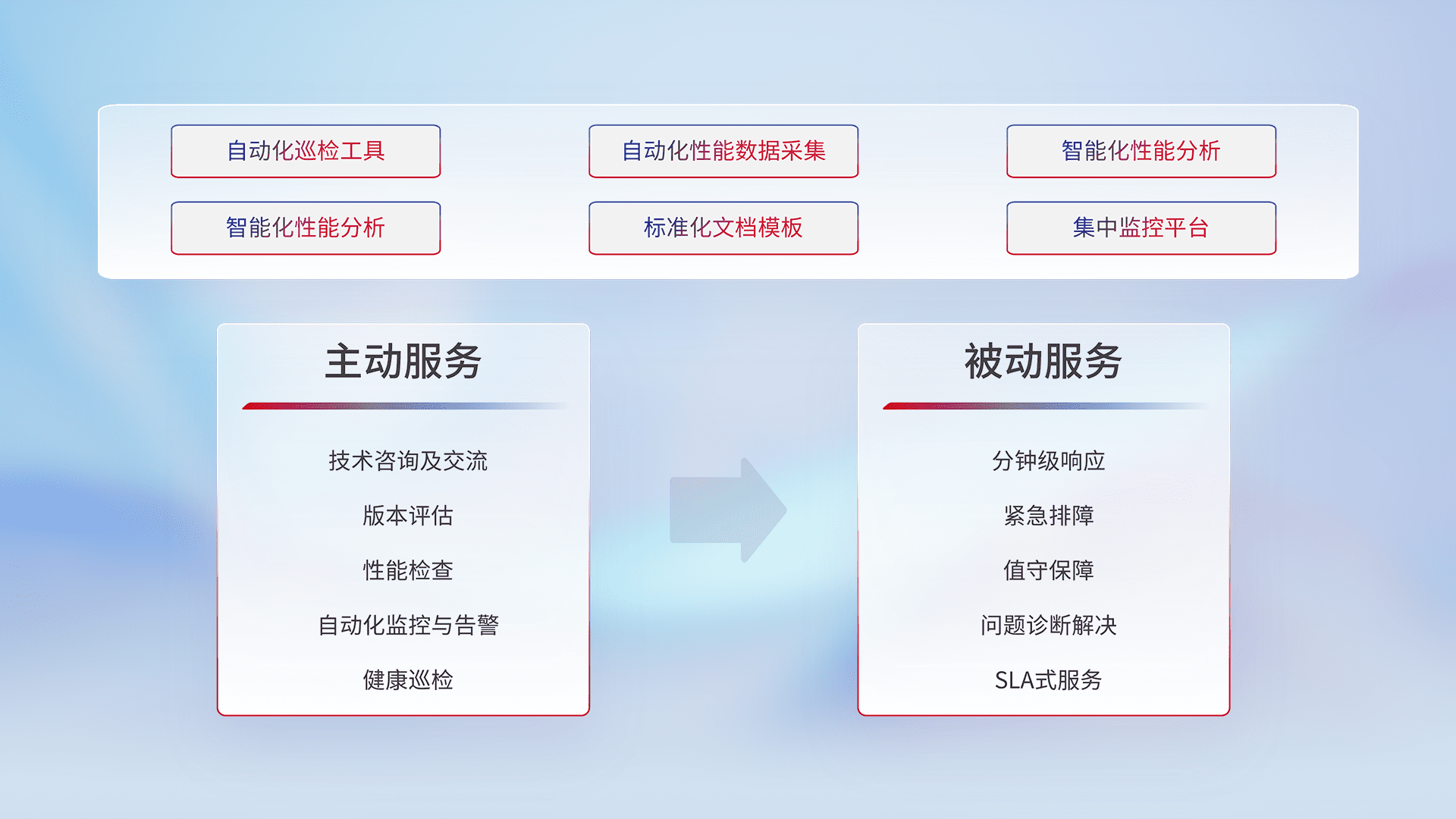 智能化工具和标准化文档,,,保障服务质量,,,,提供主动服务(包含技术咨询、、、、版本评估、、、、性能检查、、、自动化监控与告警、、、、健康巡检)和被动服务包含(分钟级响应、、、紧急排障、、、、值守保障、、、问题诊断解决、、SLA服务)。。